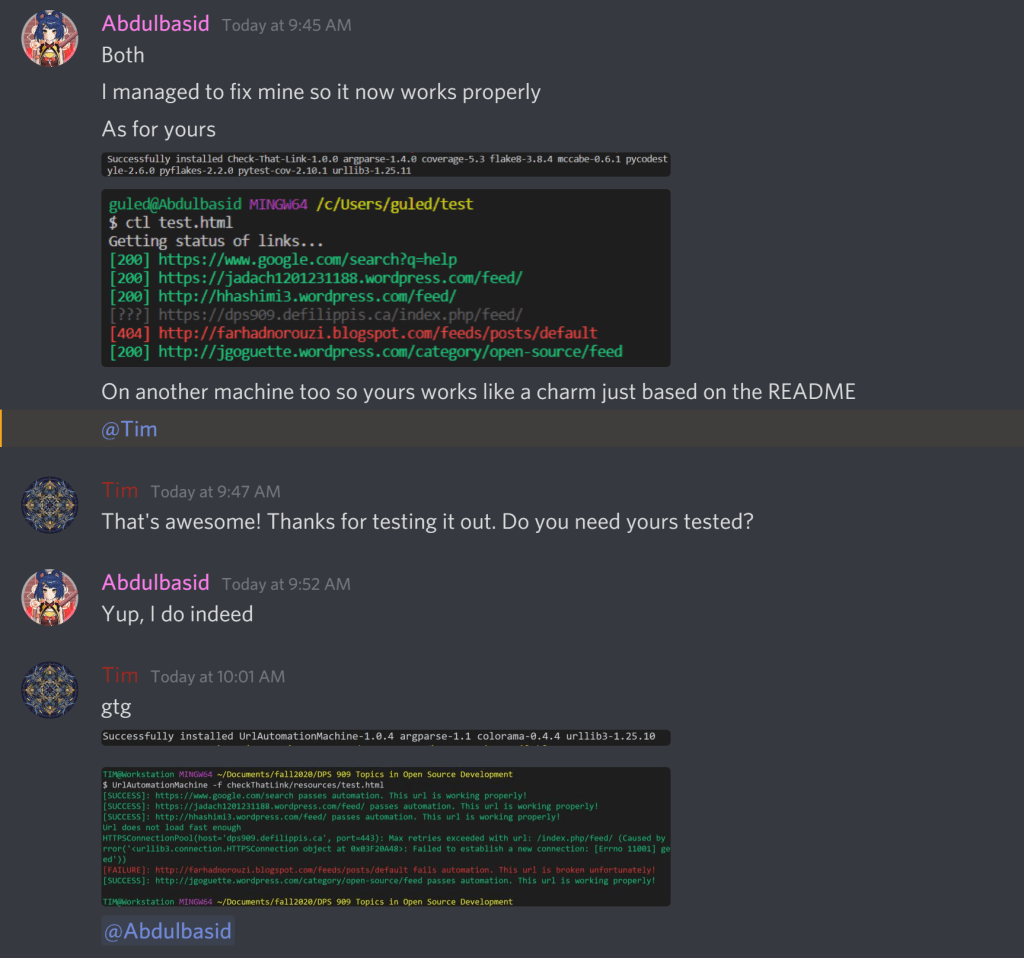 Now, the final test. I put out a couple requests in the slack channel and in a discord server I am in to ask for assistance with testing my work. Thankfully Abdul, a fellow classmate, needed someone to test his out as well. A little quid pro quo never hurt anyone.
