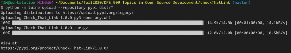 This is it, in anticipation I already added and pushed the v1.0.0 tag to the repository. After that I went back to the packaging guide and found that I needed to register an account with Pypi. In order to stop twine from prompting me ever time for my credentials I just added a .pypirc file to my root that contained my credentials. After that was all set up I went to run the command but ran into an error