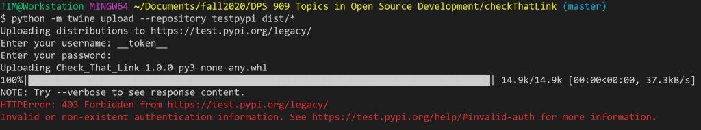 I checkout out a few things, tried it a couple more ties and it still didn’t work. it seemed like it should be working. Then I noticed the mistake. I was trying to call the test.pypi server instead of the normal one. A simple fix and my dist/ folder was uploaded to Pypi!