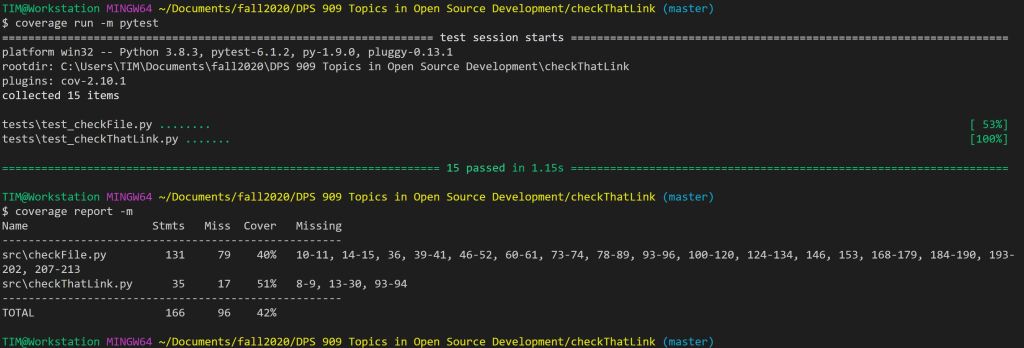 OK, I got a few tests written, time to figure out how much of my program is being covered by them. After looking around a bit it was pretty apparent that pytest-cov was the coverage tool I should use with pytest. After an install with pip I was only a few wrong bash commands away from being able to run my coverage.