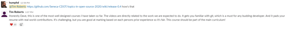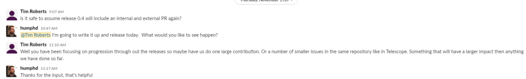 After handing in release 0.3 I was curious to know what Dave had in store for us for the final project. I wanted to start looking for an issue to do since these things can take time. I decided to ask about it on the slack channel and got a response I was not expecting.